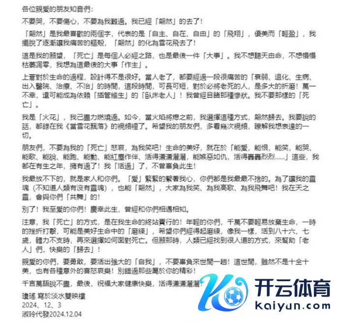 她在脸书发布的遗书中,劝慰读者“不要哭,不要伤心,不要为我痛心。我依然‘翩然’的去了”,也和煦教导,如今她的“死一火”是在我方人命的终站实践的,而尚且年青的读者们,希望公共千万不要松驰毁灭人命。