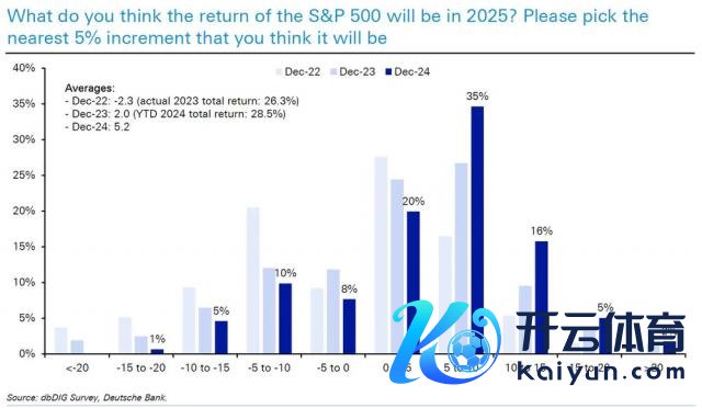 受访者平均展望标普 500 指数将在 2025 年高涨 5.2%,有 23% 的东谈主合计涨幅将超越 10%,但仍有 23% 的东谈主合计它将下降。"压倒性共鸣(35%)"合计涨幅将在 5% 到 10% 之间,况且比往年愈加鸠合。